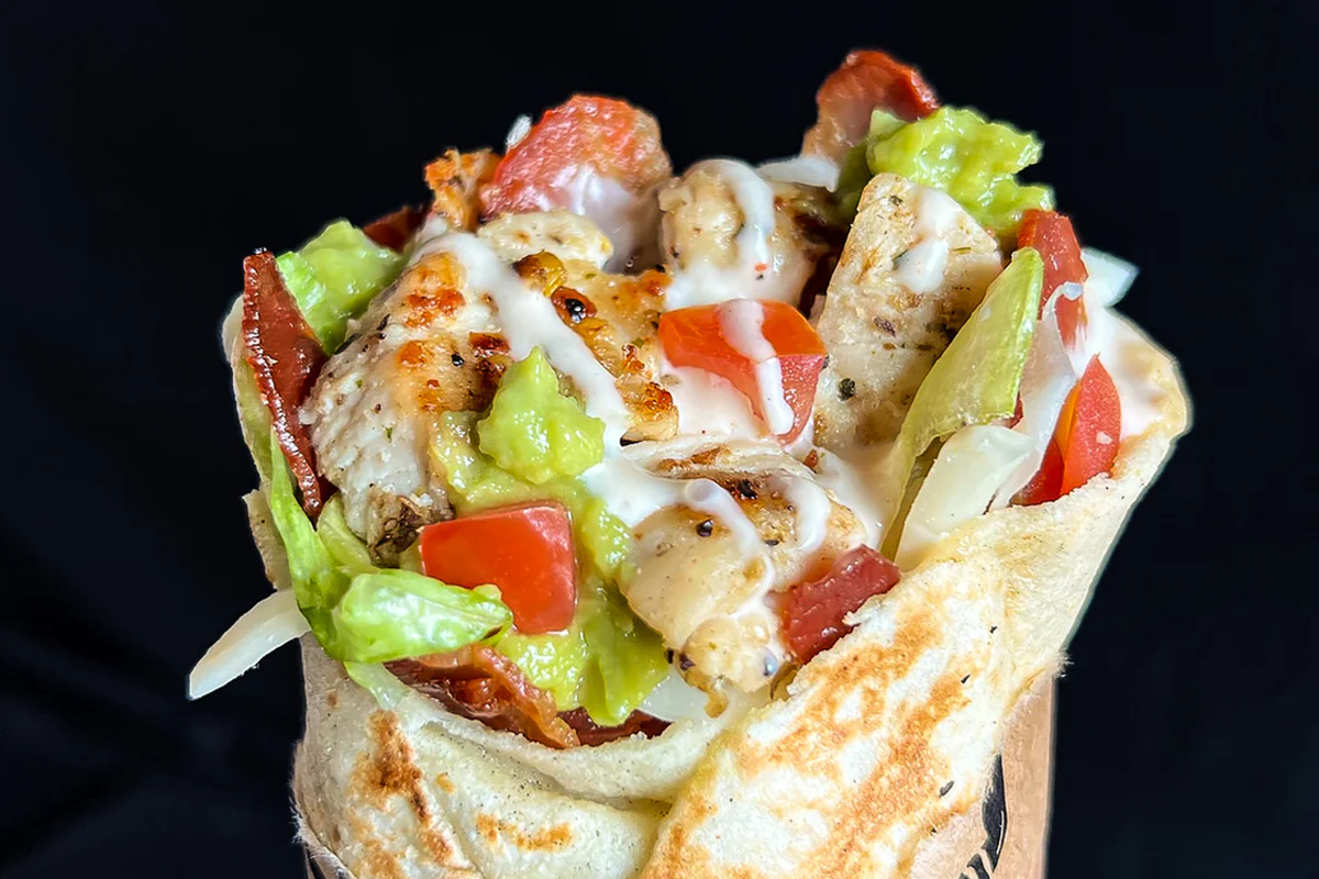 Grilled chicken with bacon, mozzarella and ranch in a pita seared in avocado oil.
