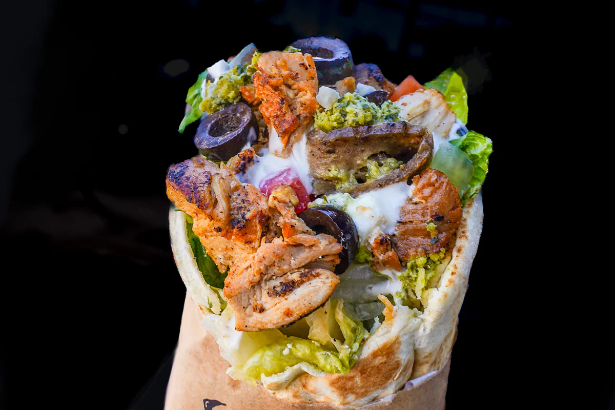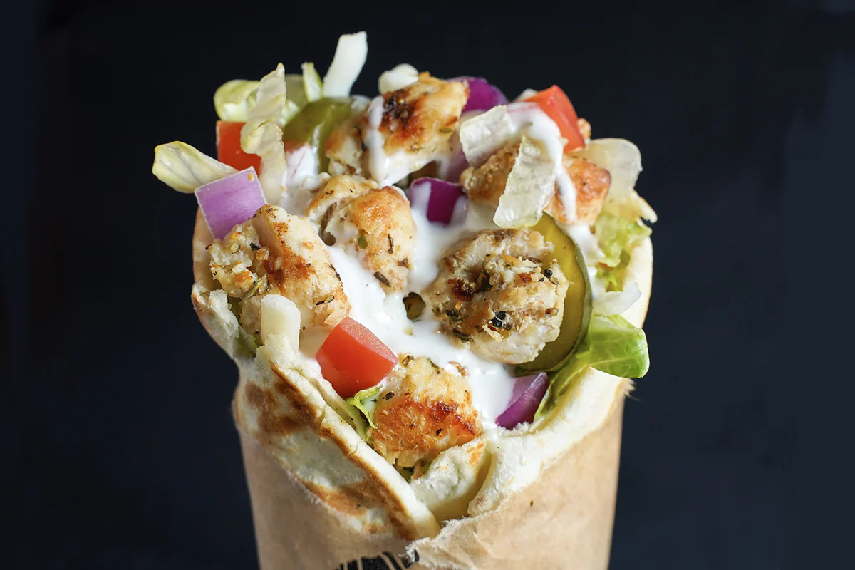 Pita sandwich Lunch Boxes include a sandwich, chips and a cookie. Salad and Brown Rice Quinoa Lunch Boxes include a salad OR Brown Rice Quinoa Bowl, pita wedges and a cookie. Seasoned chicken and gyro, romaine, tomatoes, cucumber, grilled black olives, feta cheese with tzatziki and spicy schug.