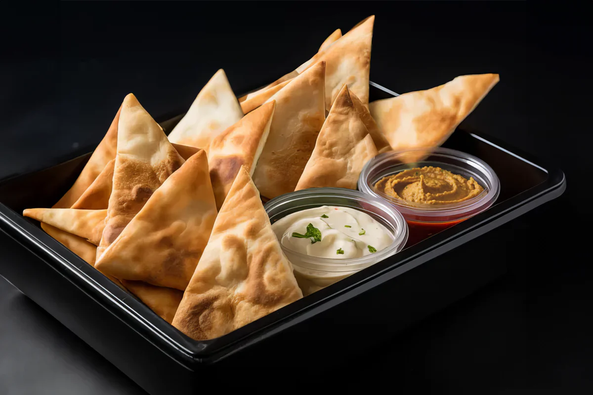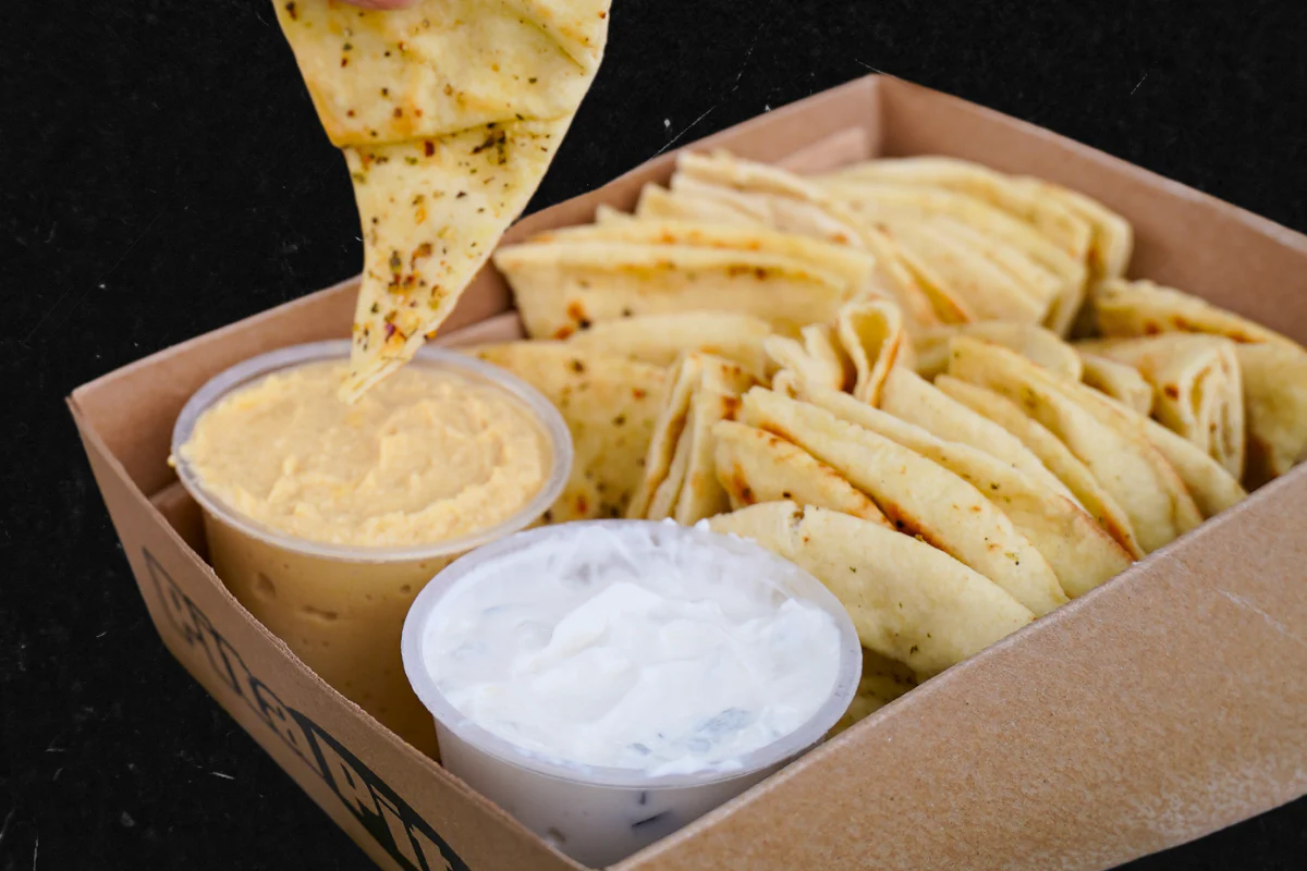 Serves 10-15 Pita wedges seasoned with Spiceology Greek Freak and lightly cooked in avocado oil. Served with your choice of two dips.