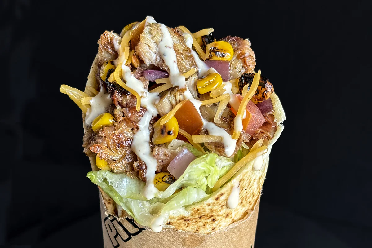 Pita sandwich Lunch Boxes include a sandwich, chips and a cookie. Salad and Brown Rice Quinoa Lunch Boxes include a salad OR Brown Rice Quinoa Bowl, pita wedges and a cookie. Seasoned pork, shredded lettuce, grilled onions, grilled corn, tomatoes, cheddar cheese and jalapeno ranch dressing.