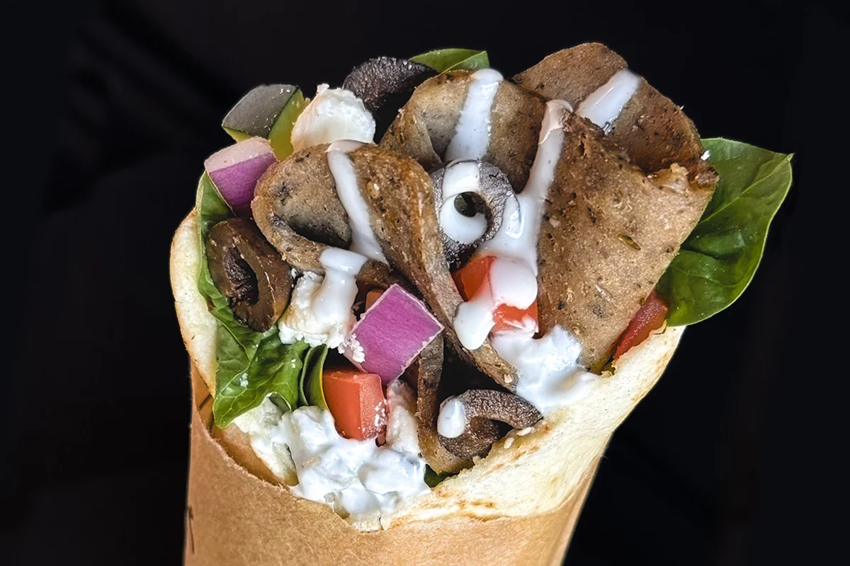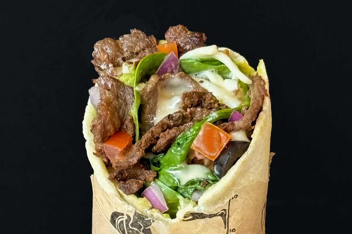 Steak, black olives, tomatoes, onions, mozzarella cheese, spinach and caesar dressing in a pita, seared in avocado oil.