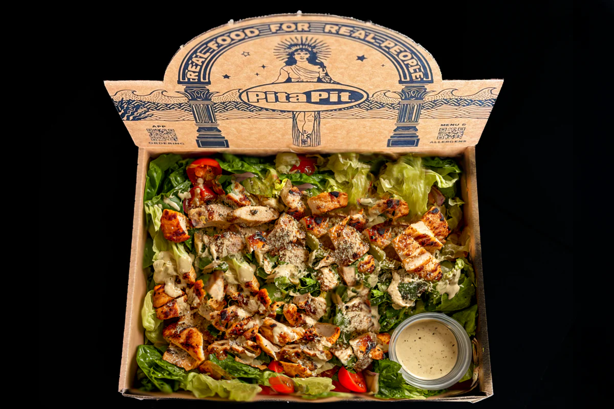 Pita sandwich Lunch Boxes include a sandwich, chips and a cookie. Salad and Brown Rice Quinoa Lunch Boxes include a salad OR Brown Rice Quinoa Bowl, pita wedges and a cookie. Seasoned chicken, bacon, romaine lettuce, tomatoes, and caesar dressing.