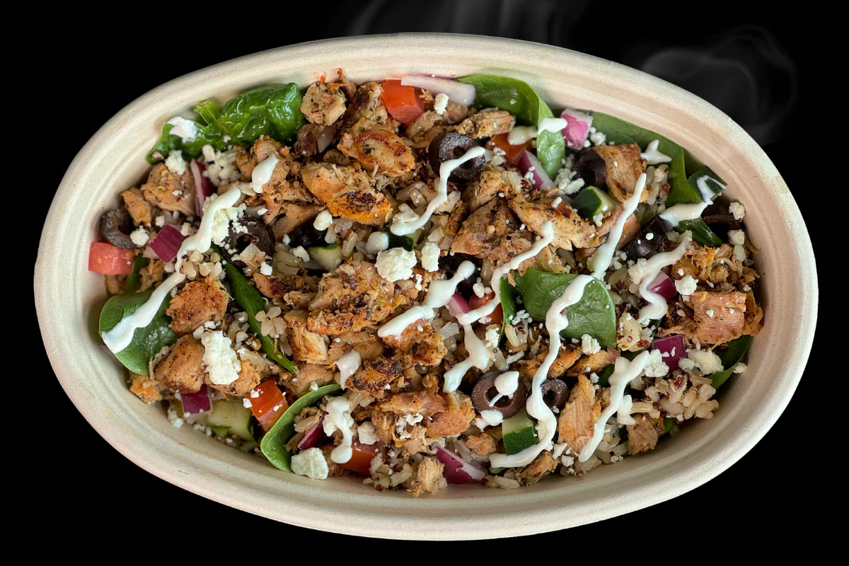 Brown Rice Quinoa topped with your choice of Gyro, Chicken Souvlaki or Falafel (Gyro meat is not gluten free)