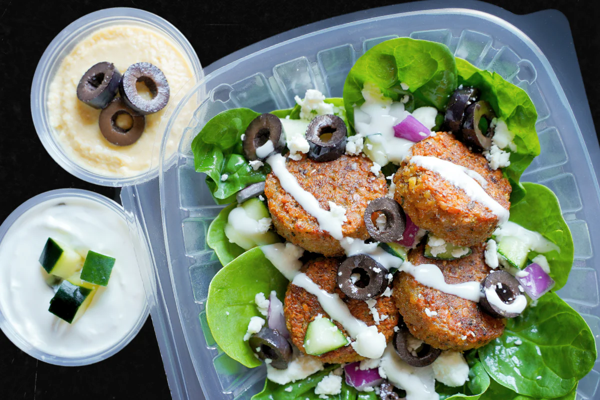 Four seasoned falafel balls grilled in avocado oil, topped with cucumbers, onions, black olives, feta and served with a side of Tzatziki
