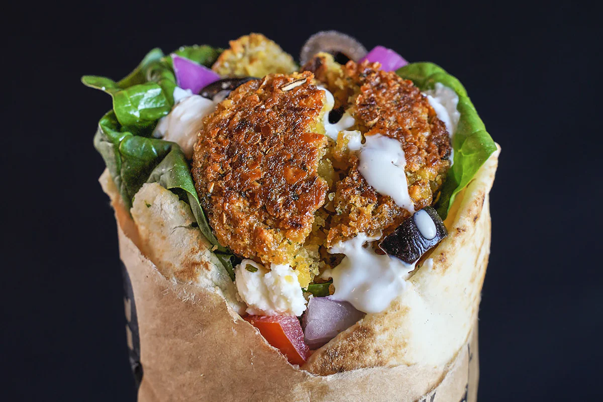 Pita sandwich Lunch Boxes include a sandwich, chips and a cookie. Salad and Brown Rice Quinoa Lunch Boxes include a salad OR Brown Rice Quinoa Bowl, pita wedges and a cookie. Seasoned falafel, spinach, tomatoes, onions, black olives, cucumber, feta and tzatziki.